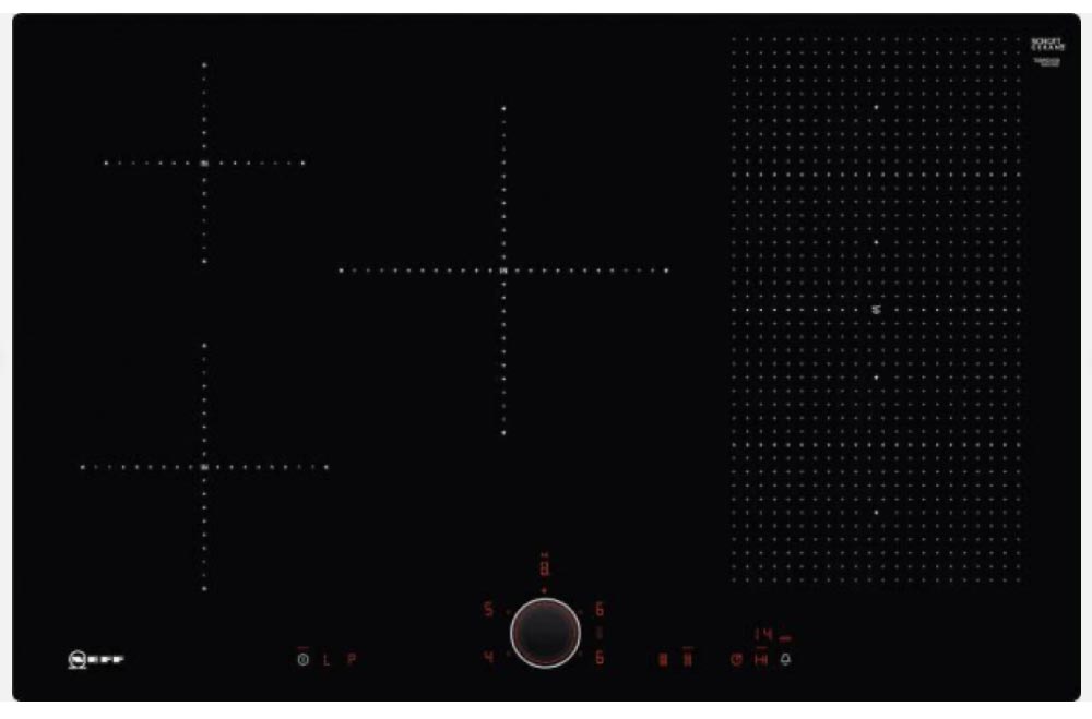 Induktionskochfeld; rahmenlos, flächenbündig einbaubar; vorne ohne Lüftungsspalt; Slider Sensorsteuerung, vorne, DirectTouch; 1 Bridge-Zone; AutoBridge; automatische Zonenaktivierung Hob’n Go; Pausenfunktion Stop’n’Go; Timer, Kurzzeitwecker; Digitalanzeige, 14 Leistungsstufen; 4 Gar-Temperaturstufen; Restwärmeanzeige; Topferkennung, Erkennung Topfposition; Kindersicherung; Boosterfunktion